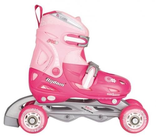 Kinder Inlineskates / Inlinequads 3 teiliger Schalen Kunststoffschuh 2 x 2 teiliger Schnellverschluss mit Schloss 82A PU high rebound Rollen ABEC 5 Kugellager Sie können diese Inlineskates umbauen zum: Quad (2x2) Trike (1x1x2) und Inliner (1x1x1x1) inkl. Stopper Zubehör: extra Rolle und Achse, Gebrauchsanleitung und einen Sechskantstiftschlüssel werden lose mitgeliefert im Verkaufskarton Marke: Nijdam® Junior